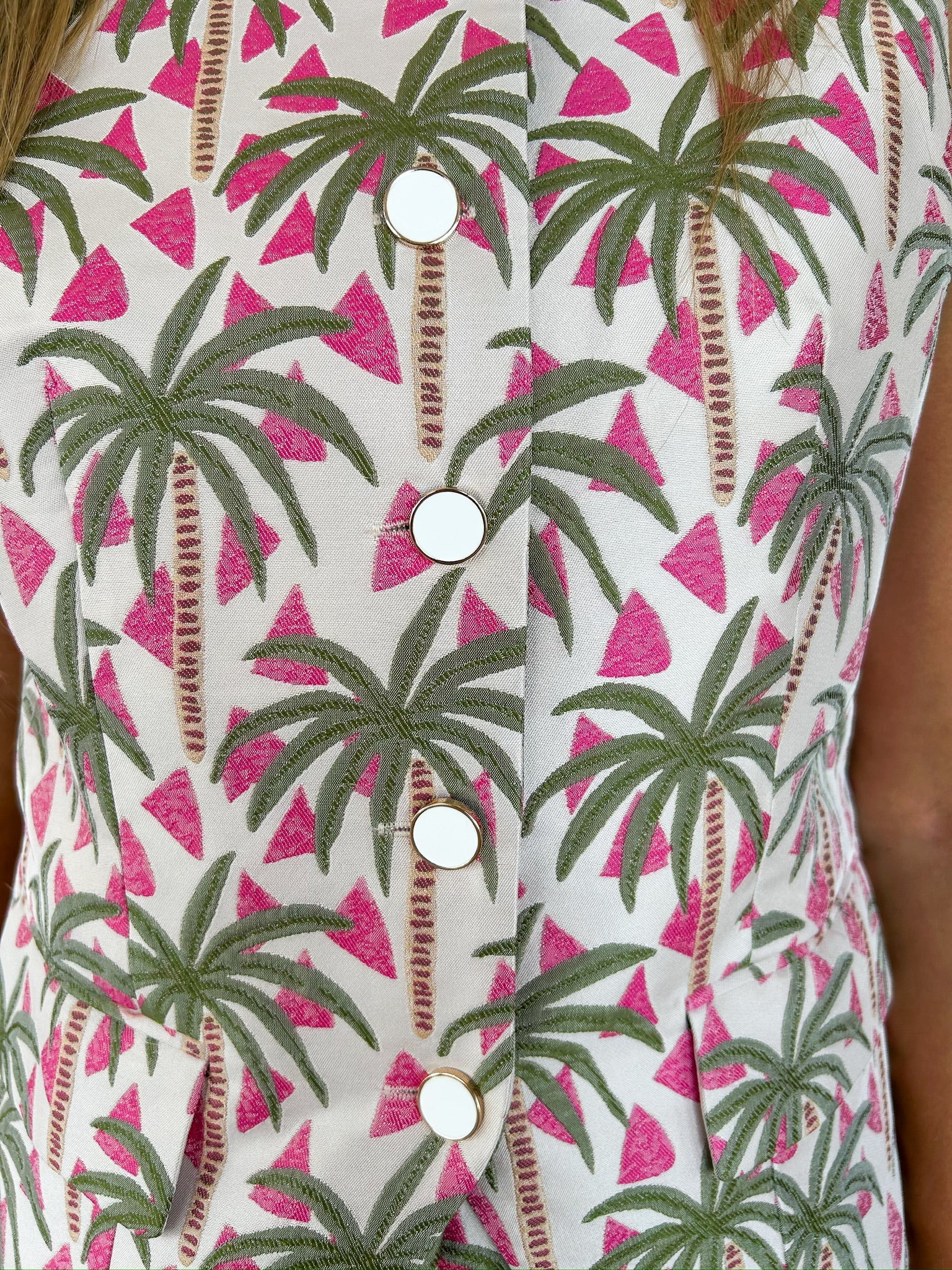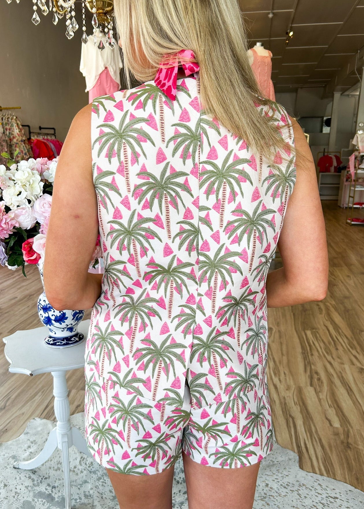 Get ready to rock that Spring Break vibe with the Palm Royale Short Set! This sleeveless button-down vest style top with a fun palm tree and pink triangle design pairs perfectly with shorts featuring pockets (yes, pockets!). The elastic waistband means you can indulge in all the snacks without a care in the world! Ideal for those vacation vibes!
