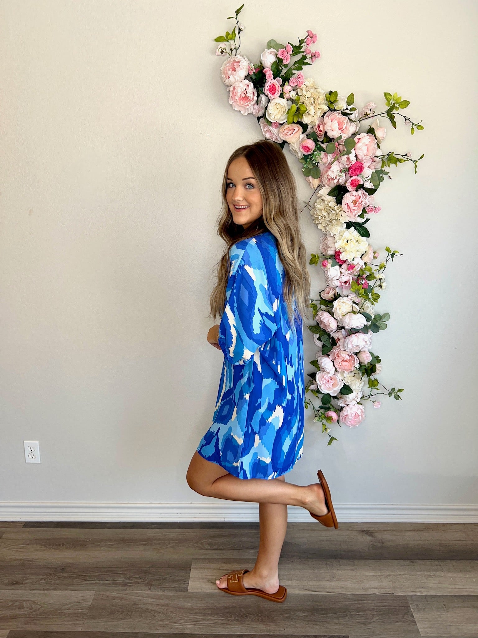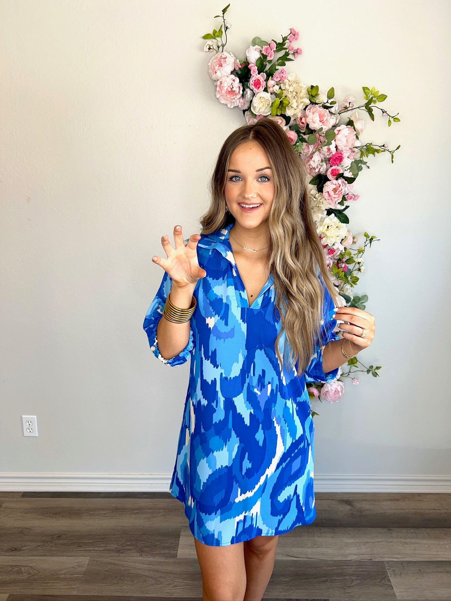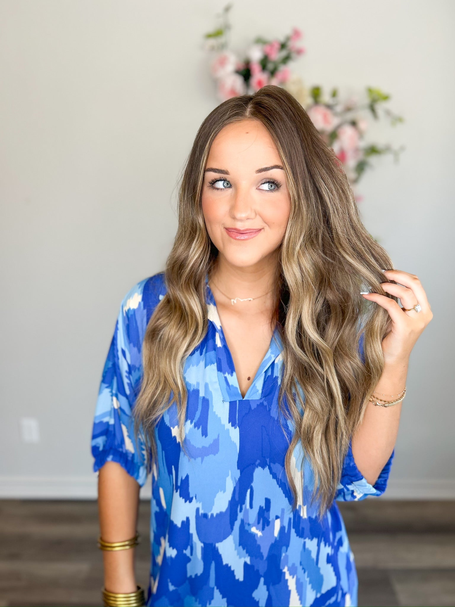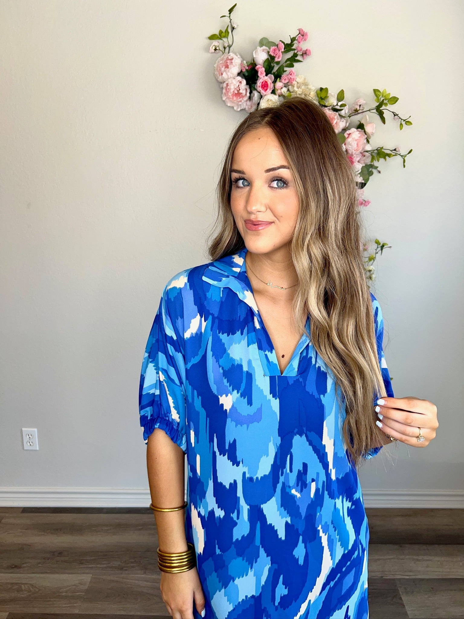 Experience the beach vibes in our Charlotte Baby Blues Dress! With a relaxed fit, V-neck and collar, this mid-length dress features a fun mix of blue shades. Made from thin, lightweight fabric, it's perfect for those hot summer days. Don't miss out on this fun and flirty look!