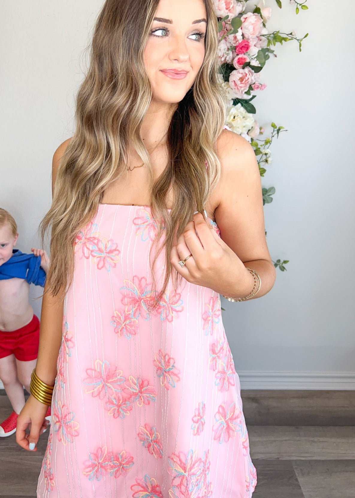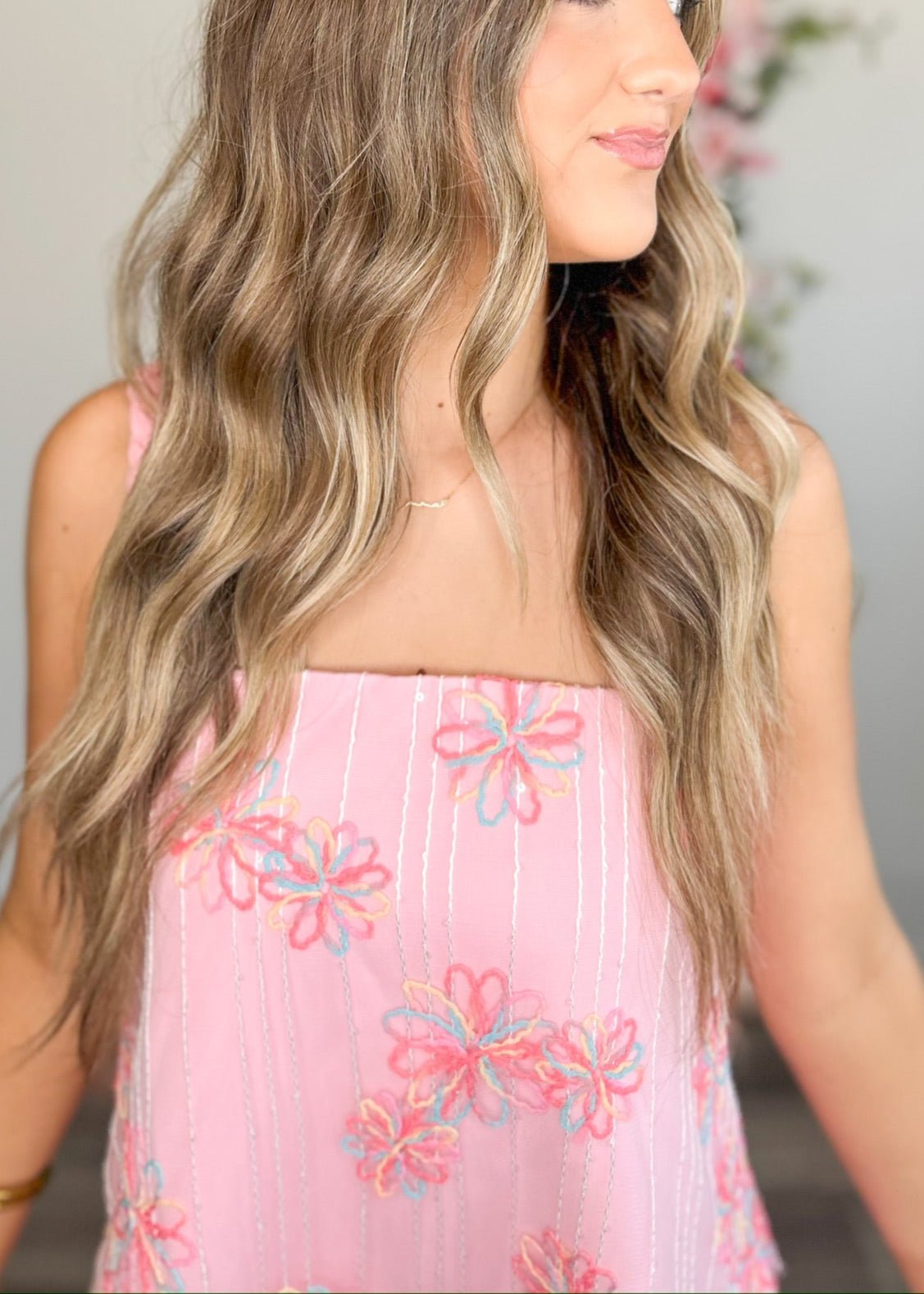 This playful and fun dress is perfect for the birthday girl or any sorority rush event. With its stitched floral design and braided spaghetti straps, you'll be the center of attention. The sheer shell adds a touch of flirty fun while the lining and side zipper provide comfort and convenience. Get ready to bloom in this Confetti Bloom Dress!