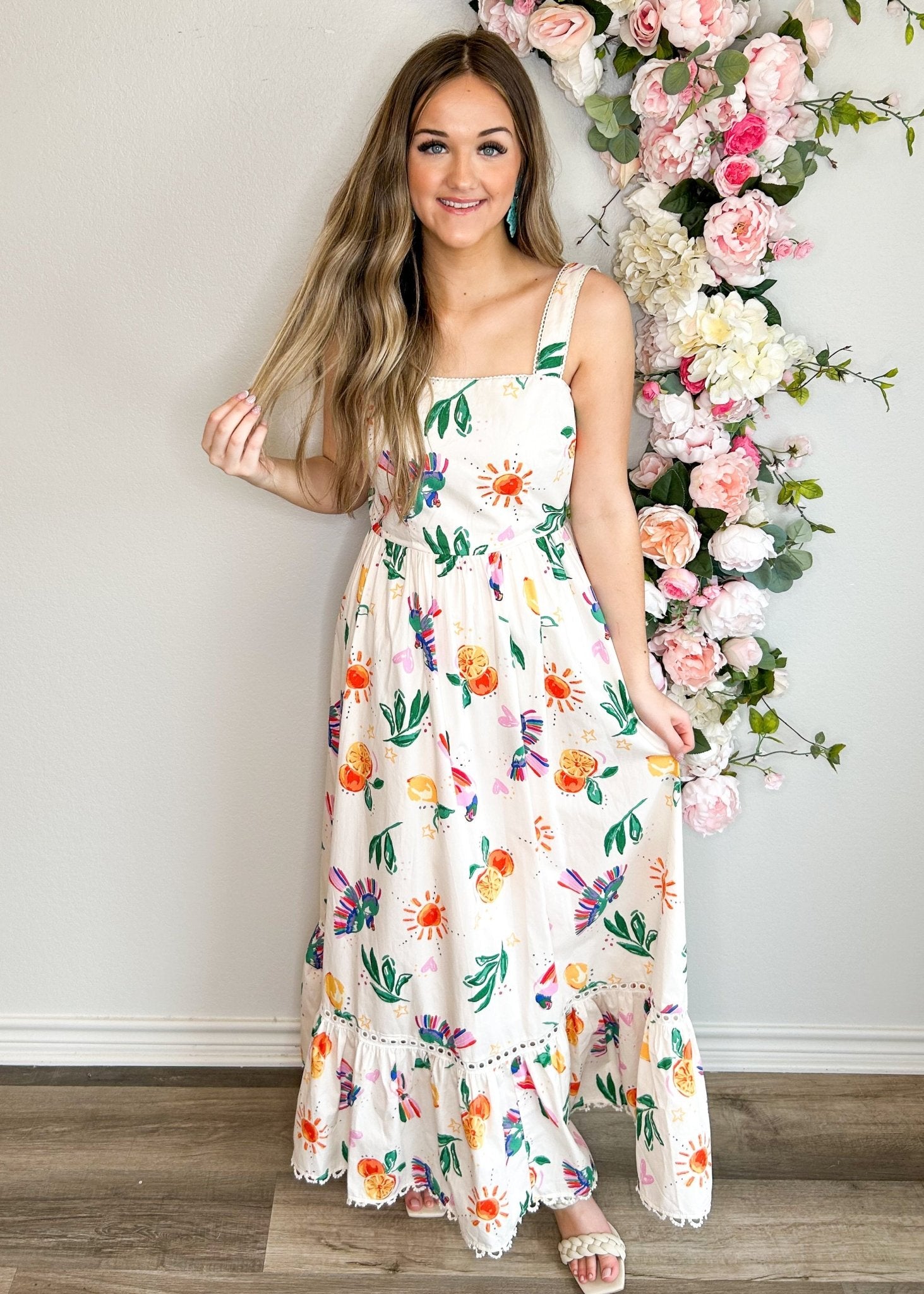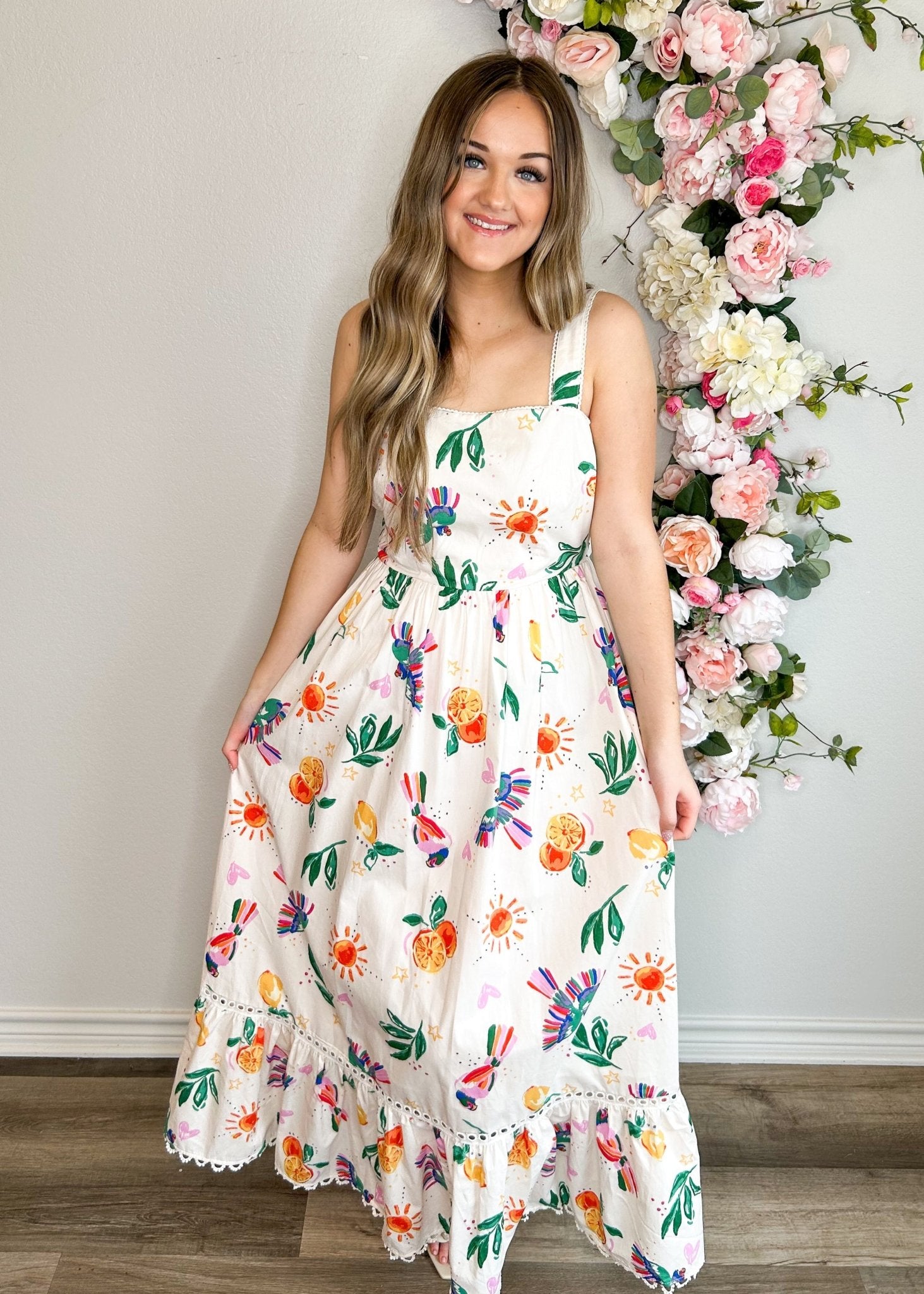Get ready for some fun in the sun with our Lemonchello Cream Maxi Dress. With its beachy design and flowy fit, this dress is perfect for family photos by the ocean. The tie in the back adds a touch of whimsy, while the delicate lace trim makes this dress a standout piece. Say cheese!