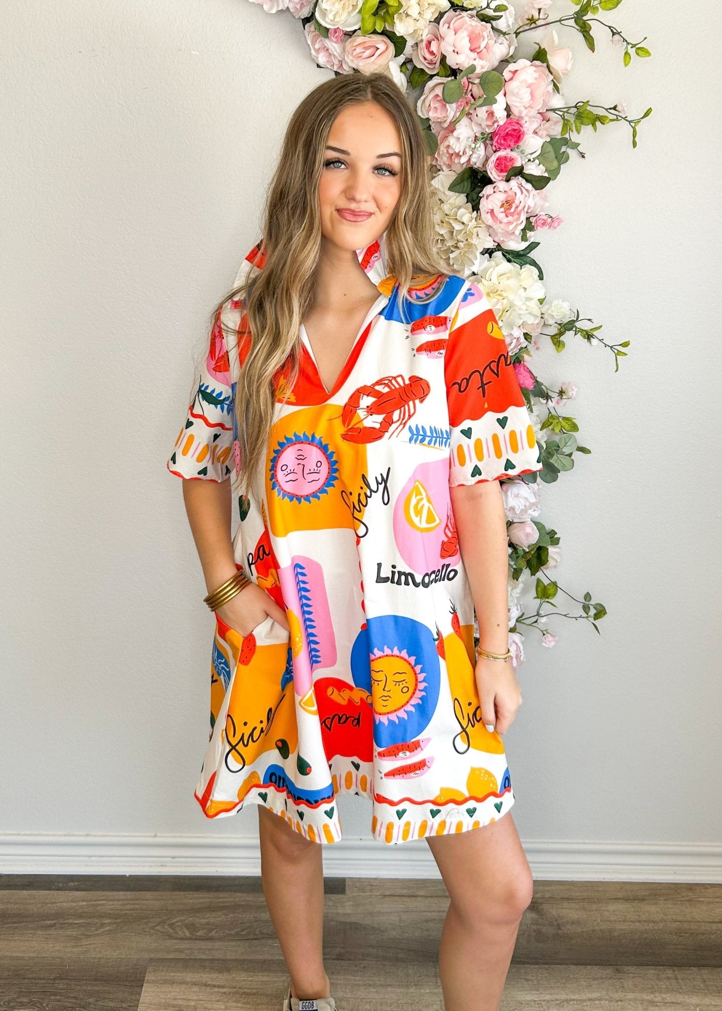 Embrace the charm of Italy with the Sicily Calls Dress, featuring a playful cute pattern and breezy, relaxed oversize fit. Fully lined for comfort, it boasts a flirty ruffle collar and flattering V-neck, while handy pockets add a touch of practicality. Perfect for sunny days and carefree adventures.
