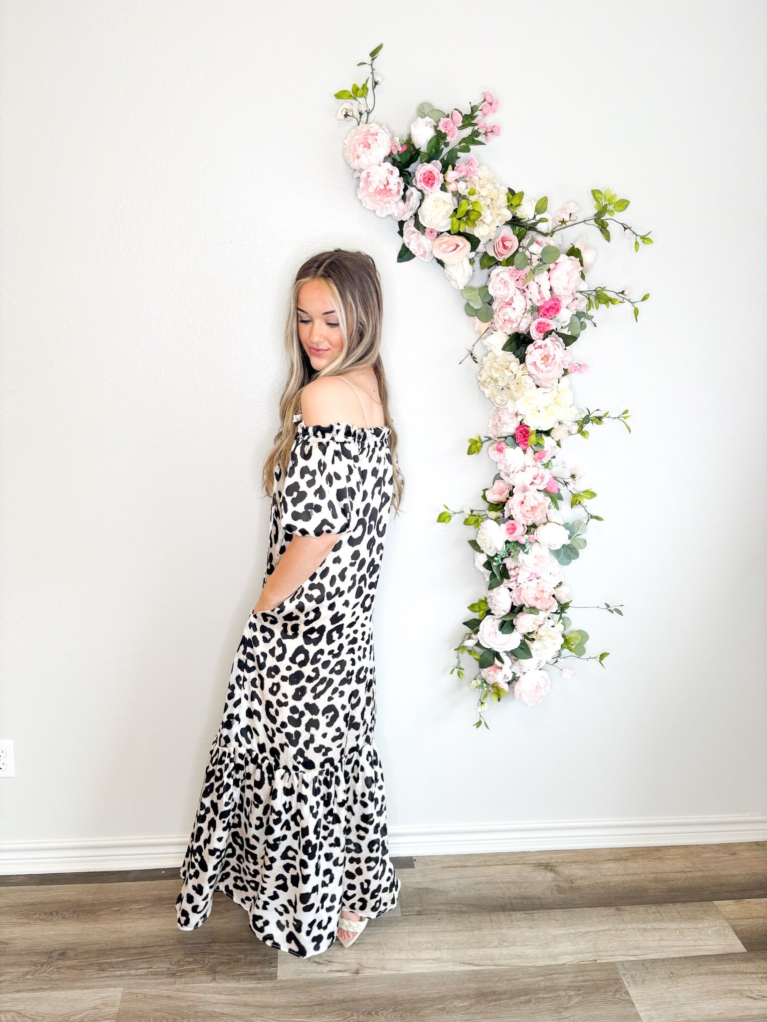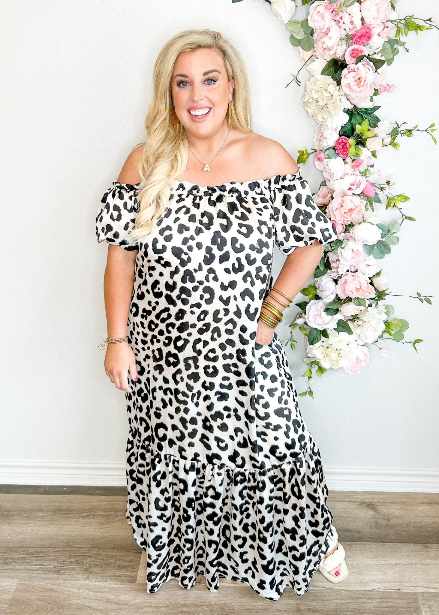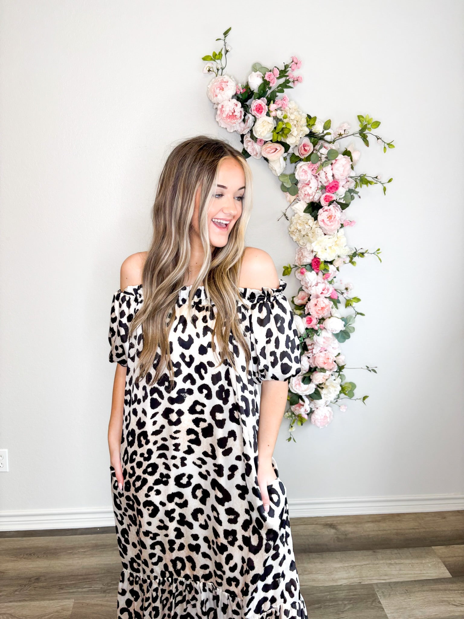 Get ready to turn heads in our Snow Leopard Luxe Off The Shoulder Dress! With its silky smooth fabric, puff sleeves, and flowy fit, this dress is as comfortable as it is stylish. The bold and wild leopard print adds a touch of playful charm to any occasion.