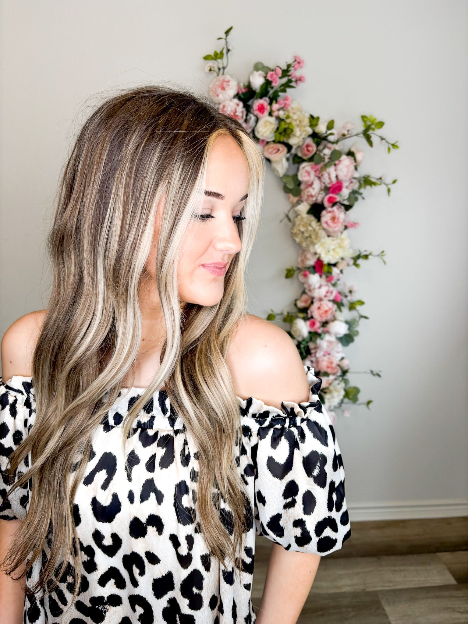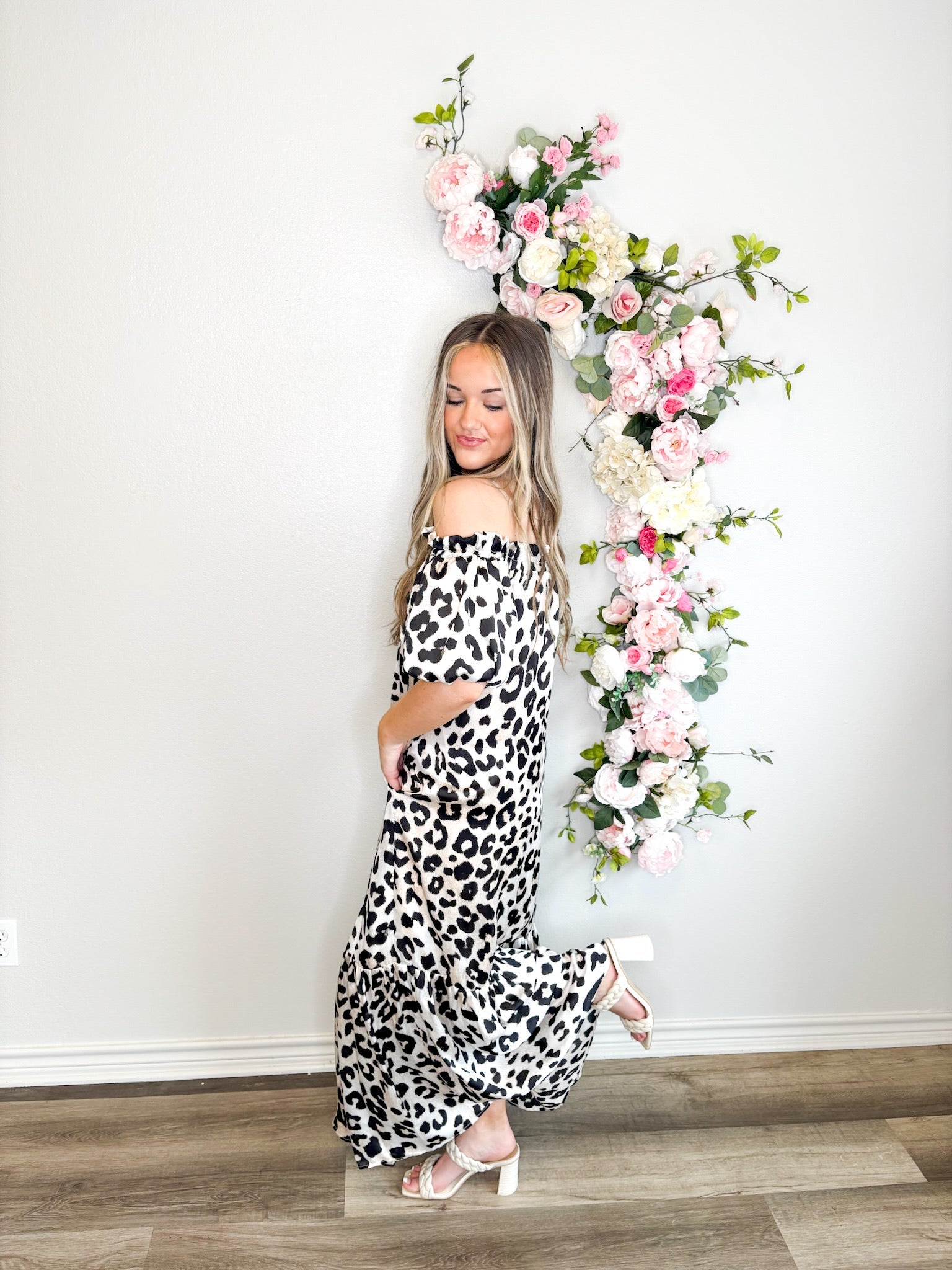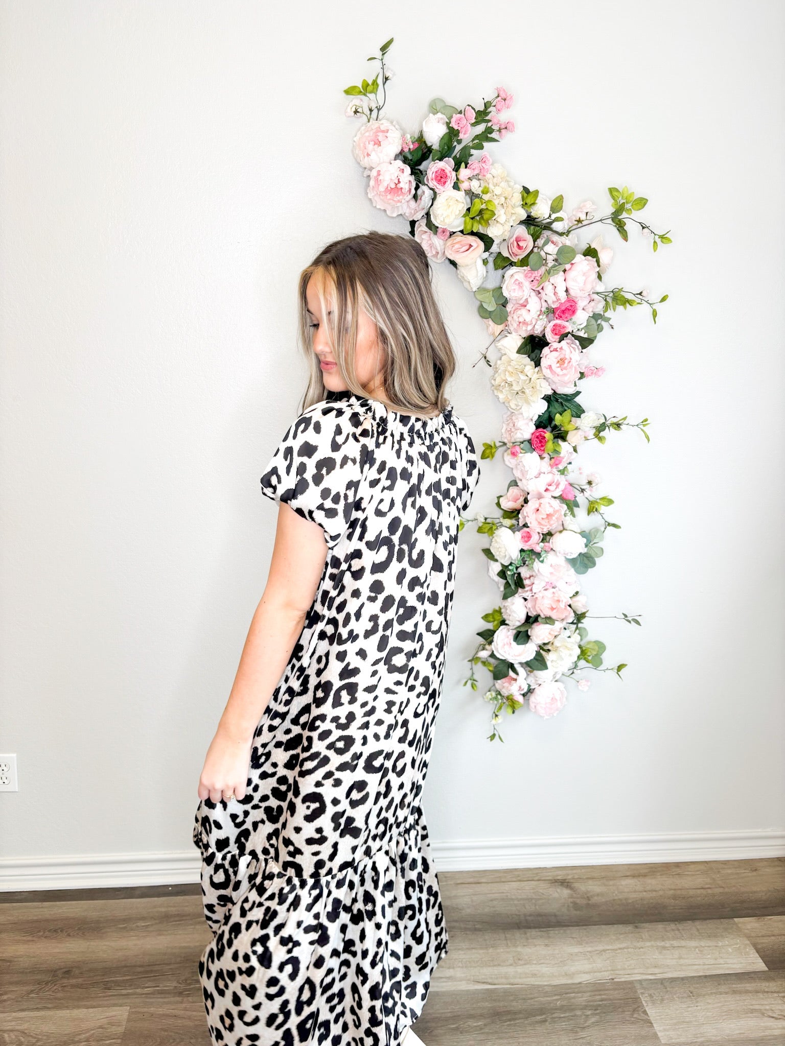 Get ready to turn heads in our Snow Leopard Luxe Off The Shoulder Dress! With its silky smooth fabric, puff sleeves, and flowy fit, this dress is as comfortable as it is stylish. The bold and wild leopard print adds a touch of playful charm to any occasion.