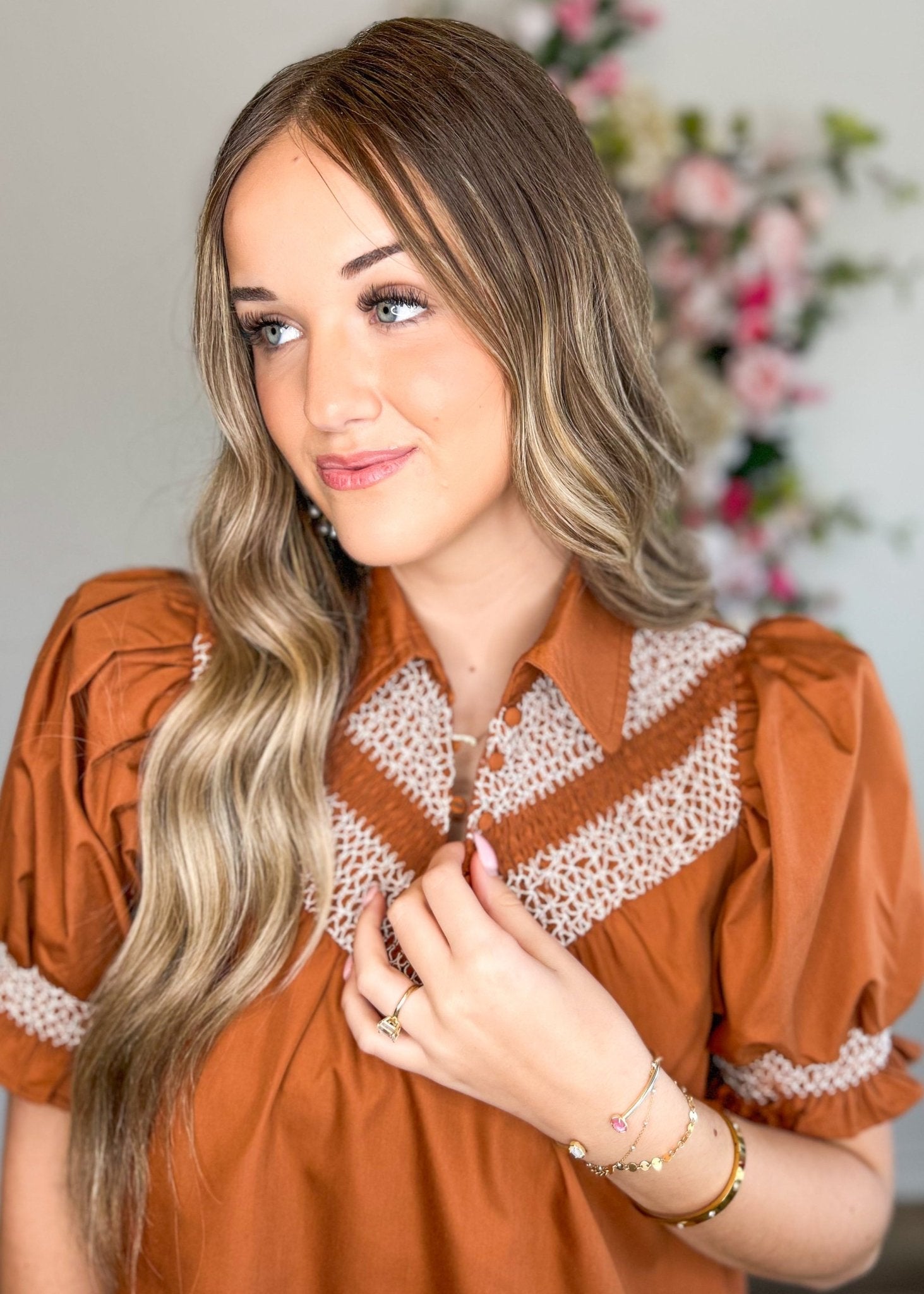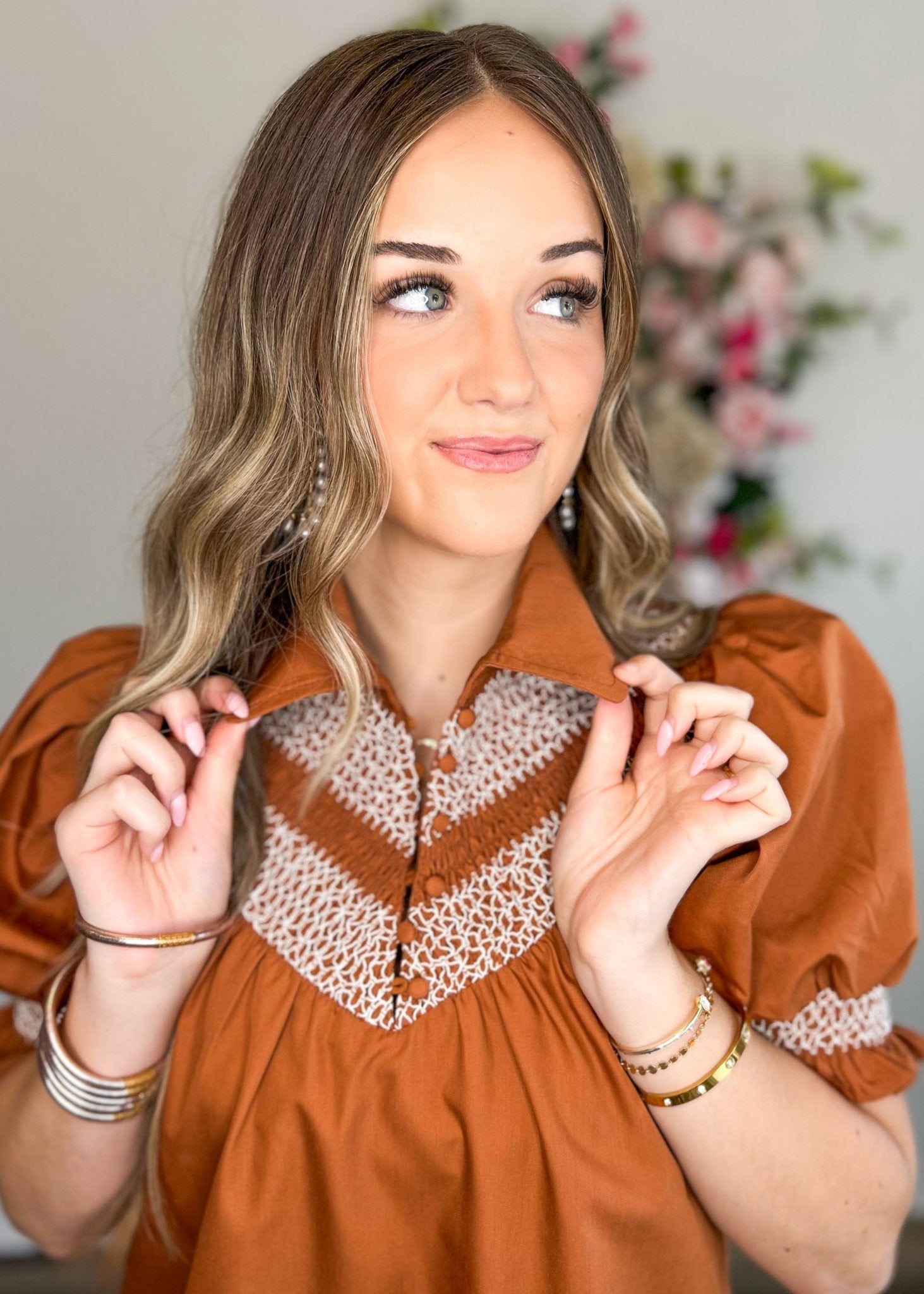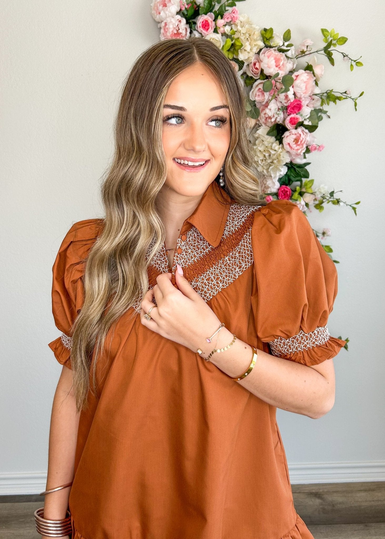 Features: collared, puff sleeves, ruffle detailing