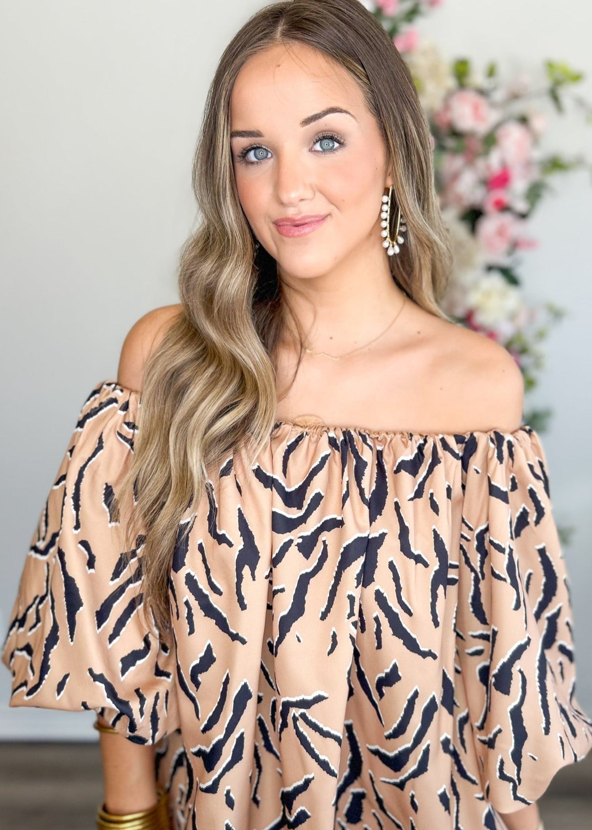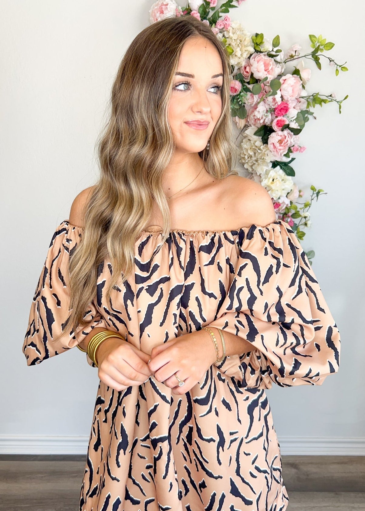 Unleash your wild side in this off-the-shoulder dress featuring playful stripes. Combining comfort and style, it's the perfect choice for a fun and unique look. Get ready to turn heads and make a statement with this quirky yet charming piece. (Meow!)