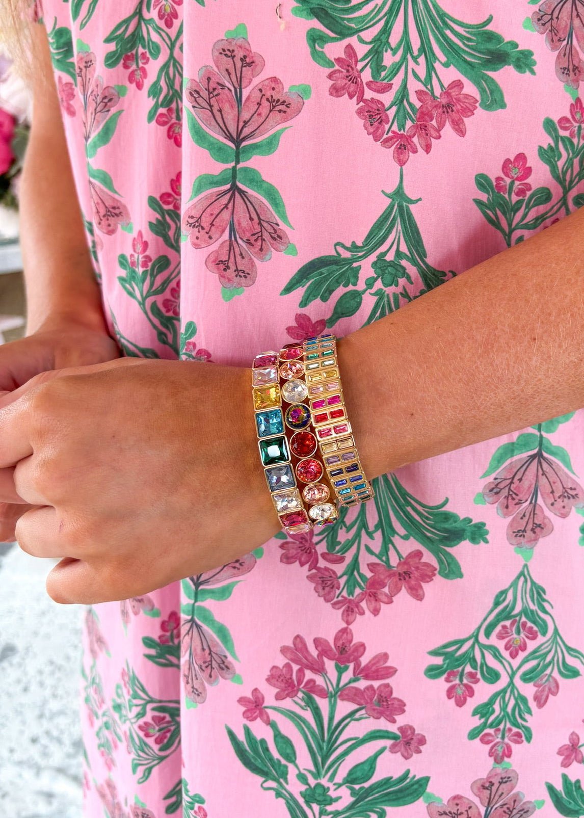The Circle Rainbow Bracelet features a gold construction and circle-shaped gems, designed for a vibrant and eye-catching aesthetic. Its stretchy design ensures a comfortable fit for various wrist sizes. For a layered effect, it can be paired with the square and rectangle rainbow bracelets, enhancing visual appeal and versatility in styling.
