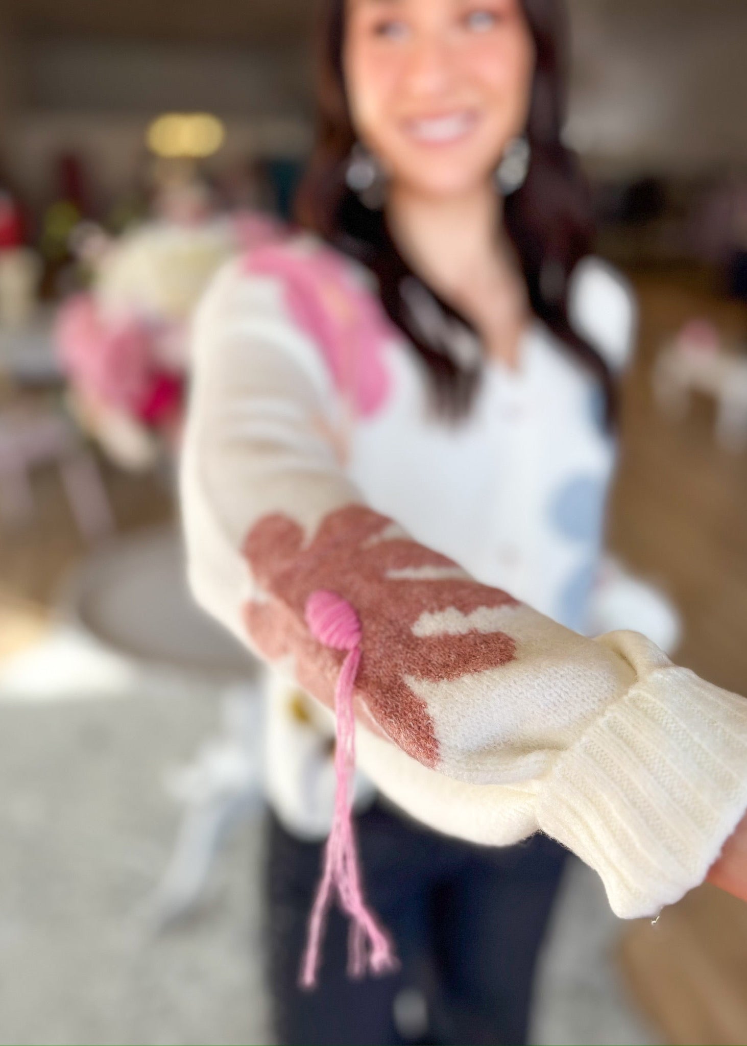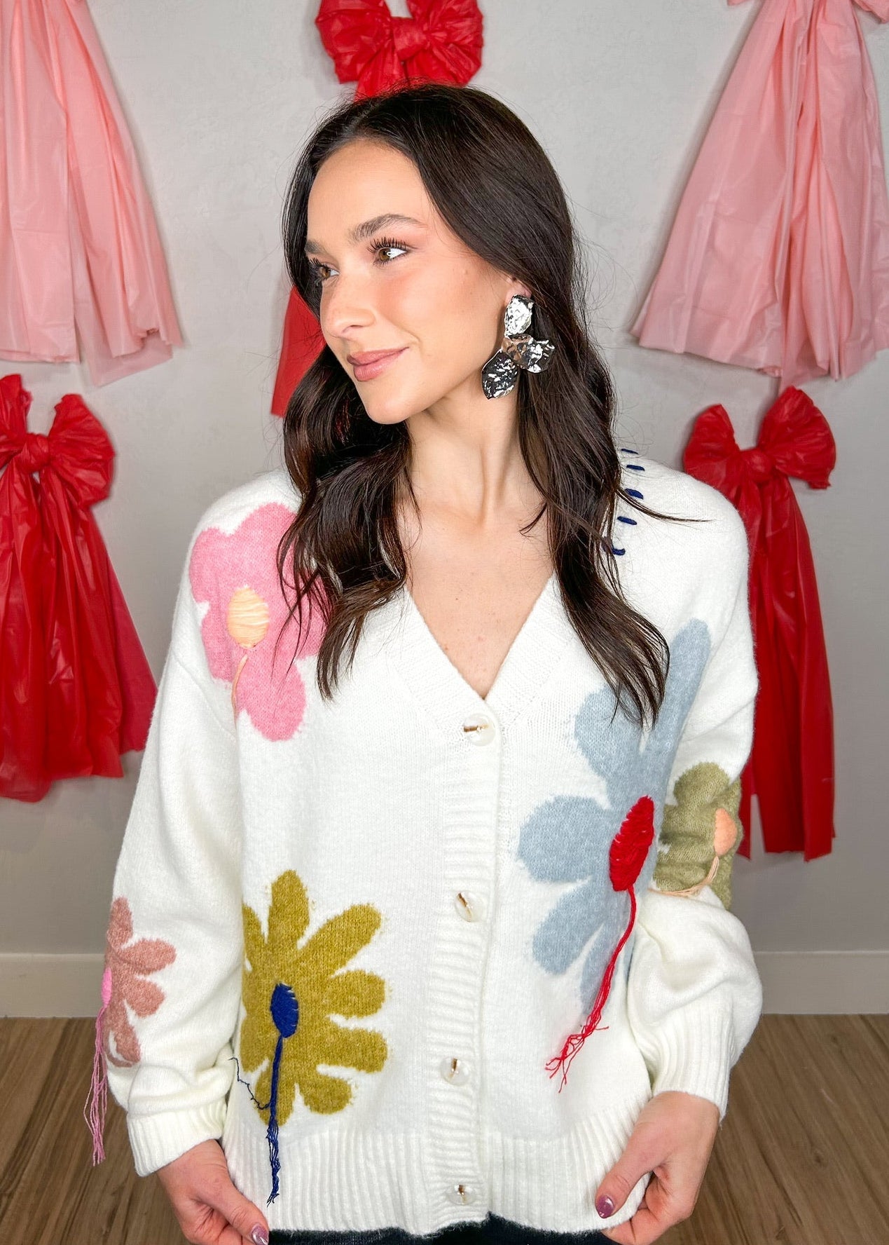 Say hello to floral fabulosity with the First of Spring Cardigan! This soft, multicolor masterpiece is like a garden party for your wardrobe (minus the bees, thankfully). With its low-cut design and fringed flower centers, it’s perfect for giving your look a lift—or just cozying up with a good book. Spring has sprung, and so has your style!