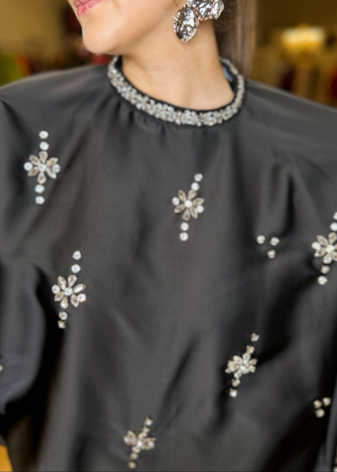 Features: jewels on front, jeweled neck detail, buttoned wrists, stretchy elastic hem, roomy fit, relaxed sleeve