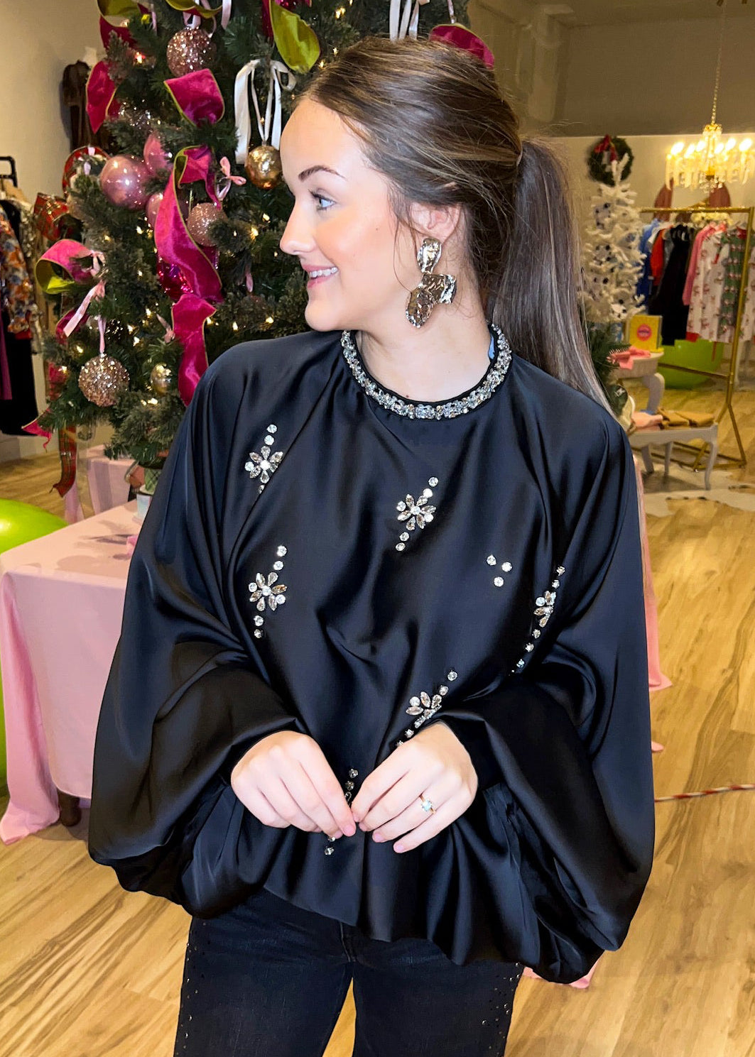 Spread holiday cheer in this festive Holly Jolly Jewels Top! Adorned with sparkling jewel details at the neckline and front, this silky beauty combines elegance with comfort. The stretchy elastic hem ensures a flattering fit for all sizes, while charming buttoned wrist details add a touch of sophistication. Perfect for celebrating in style, this one-size wonder is your go-to piece for making a dazzling statement this season.