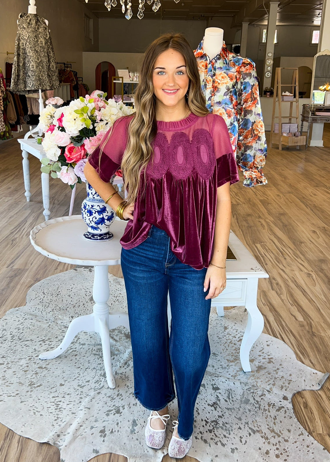Features: velvet material, flowy, lace detail