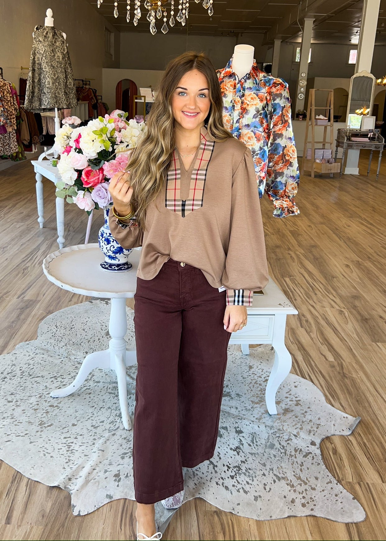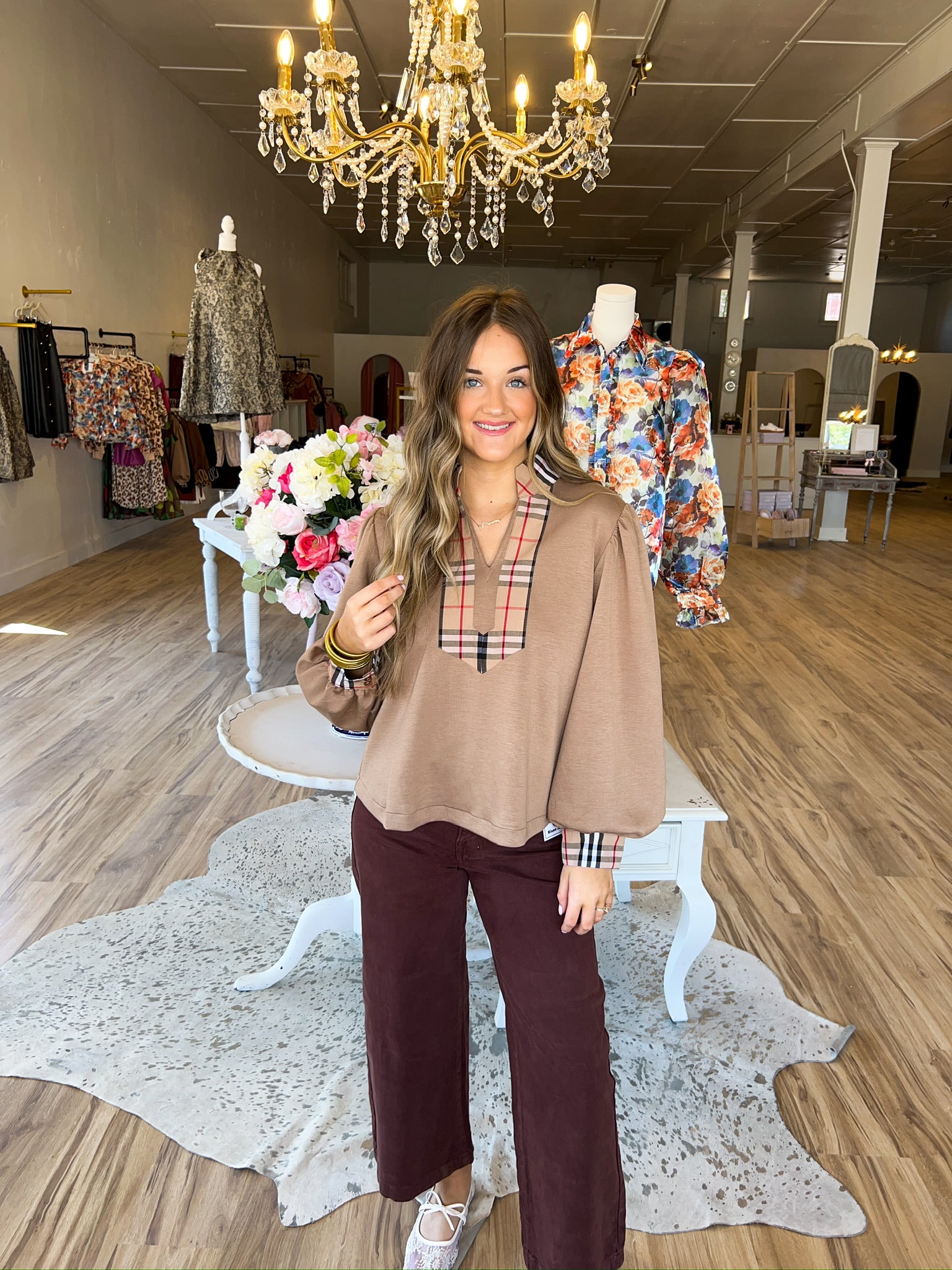 Experience luxe vibes with our Burberry Vibes Top. The lightweight silky feel and plaid print on the collar and cuffs give off a rich girl aesthetic. Perfect for cooler weather, this v-neck top is a must-have fall staple. Get ready to elevate your wardrobe game!