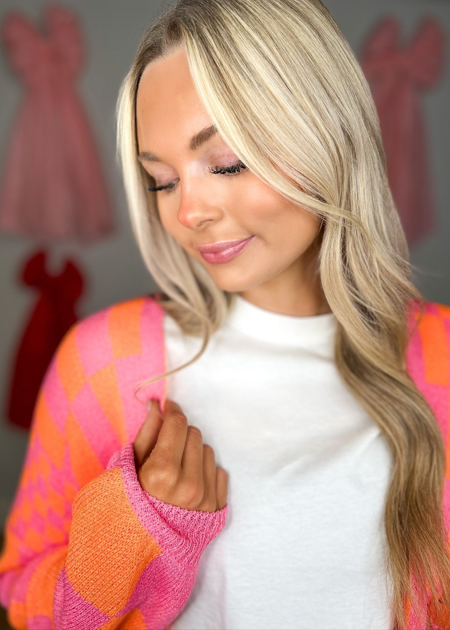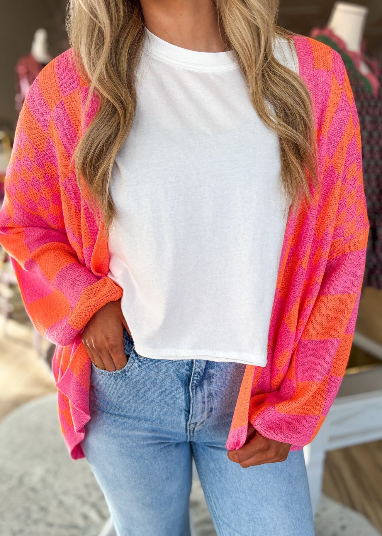 Get ready to check yourself before you wreck yourself! The Check Mate Cardigan is a vibrant pink and orange snuggle-fest for your torso. Perfect for cozying up on the couch or strutting your stuff out on the streets, this comfy cutie adds a splash of color to your wardrobe—because who needs a dull day, right? She has pockets, a soft knit material and fit!