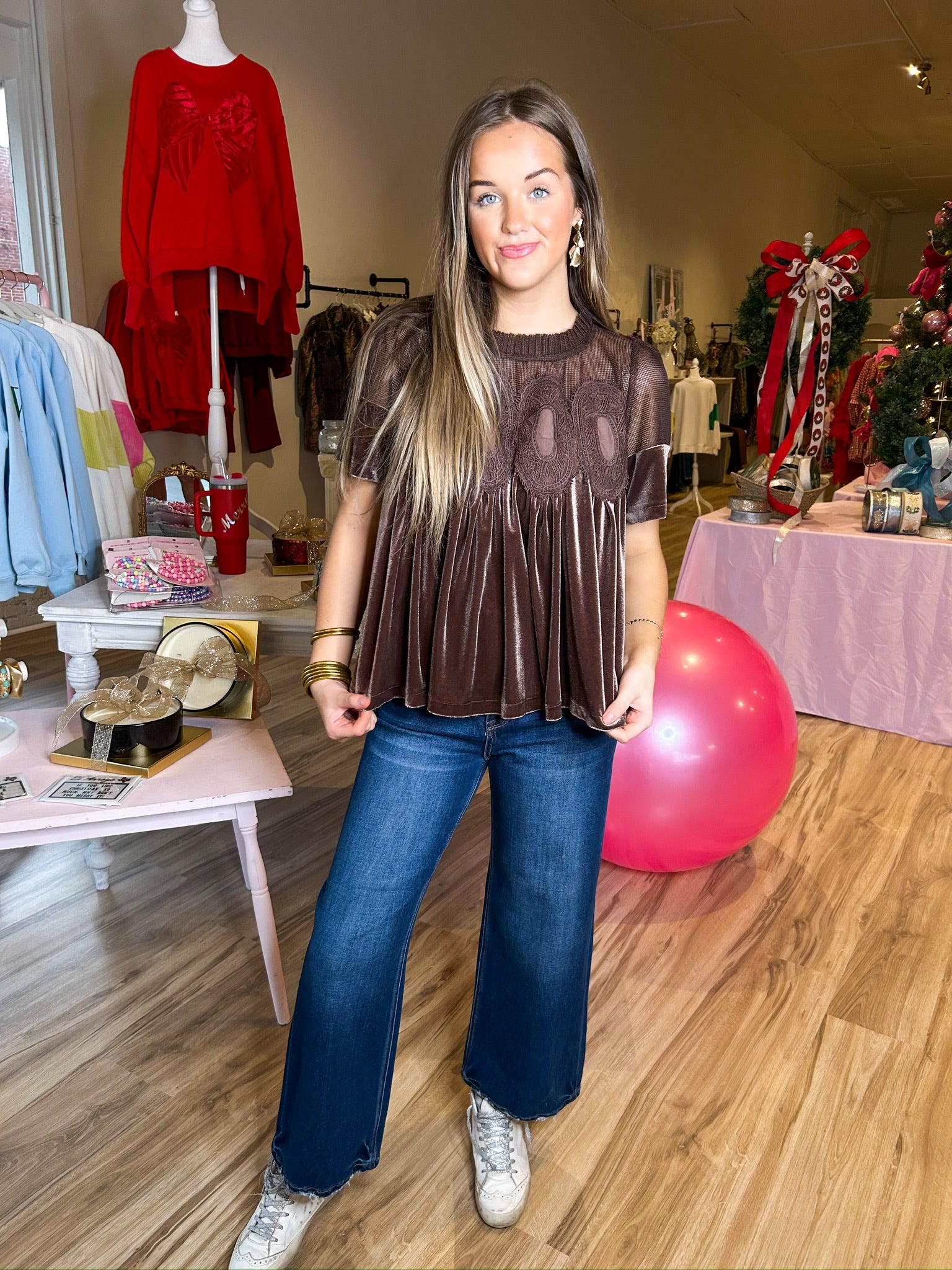 Introducing the Cocoa Velvet Top - the must-have addition to your fall wardrobe. This versatile piece is the perfect neutral, adding a touch of luxe to any outfit. With its flowy fit, it's sure to become your go-to for any occasion. Score one now!