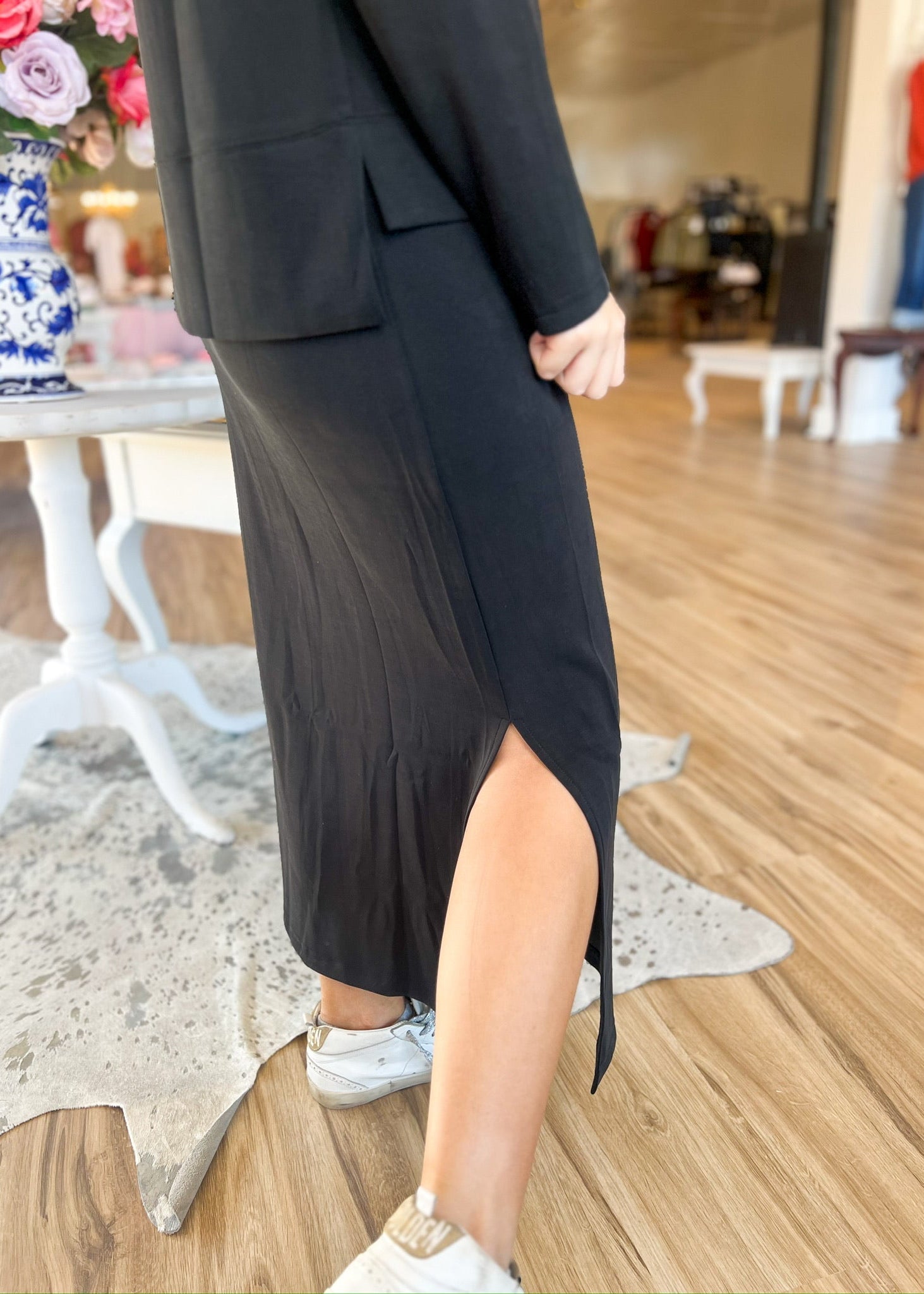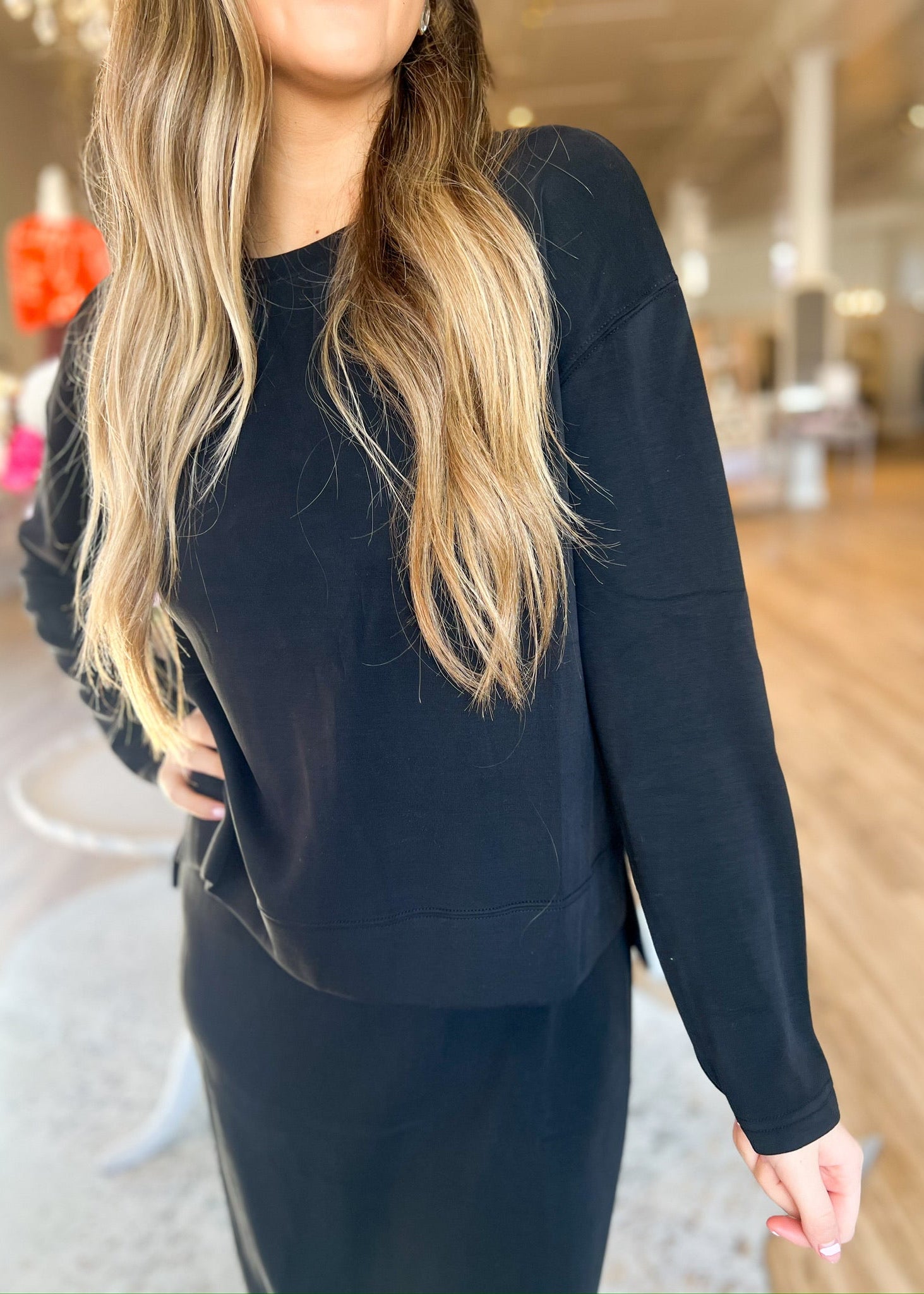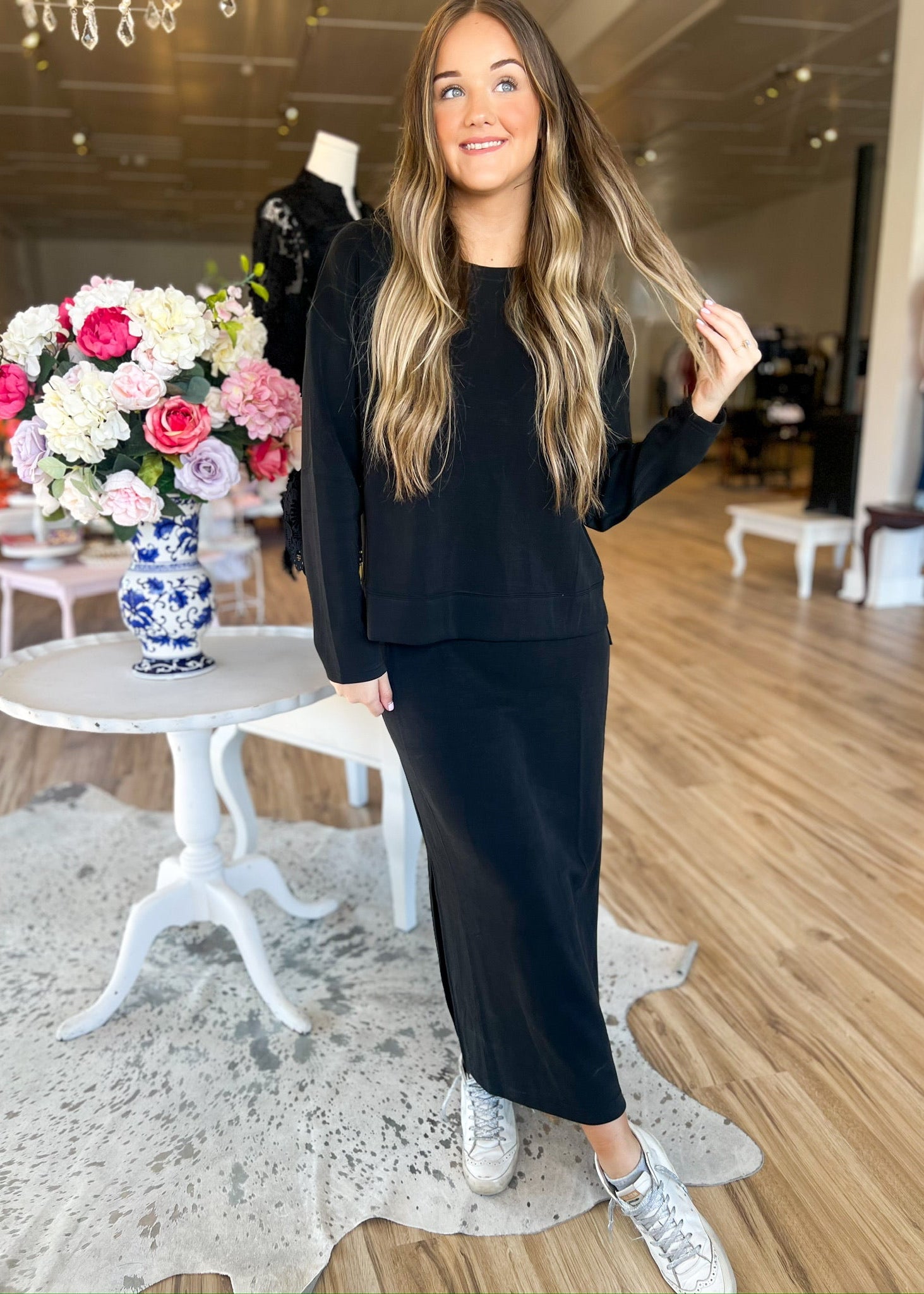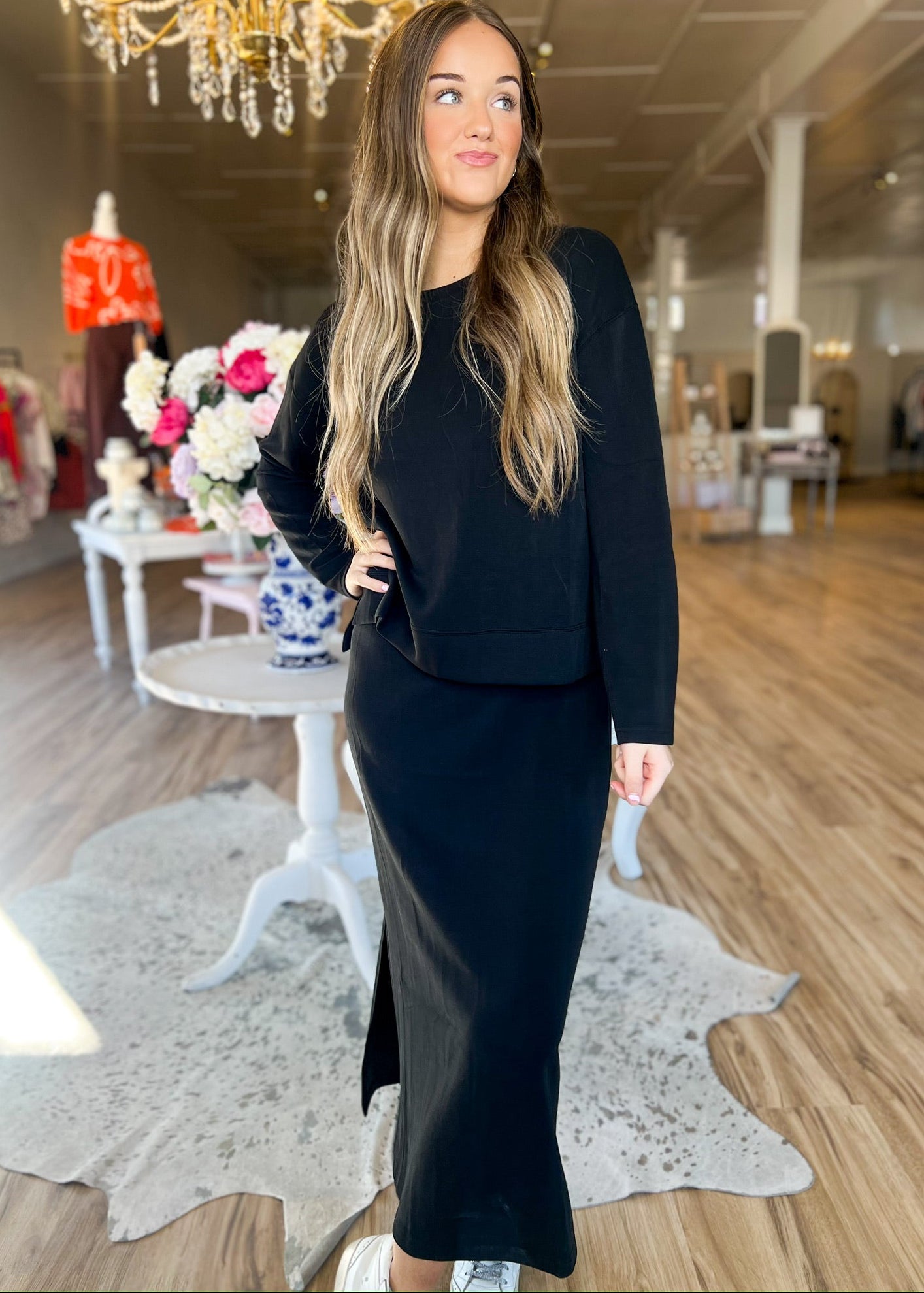 The Midnight Muse Dress Set is your new go-to for effortless style that actually feels amazing. This clever two-piece combo pairs a cozy sweatshirt top with a sleek dress, giving you that perfect blend of comfort and chic. Crafted from butter-soft, stretchy material that moves with you all day, it's like wearing a cloud that looks put-together. The side slit adds just the right amount of sass to keep things interesting. Whether you're running errands or meeting friends, this set makes getting dressed feel like a breeze.