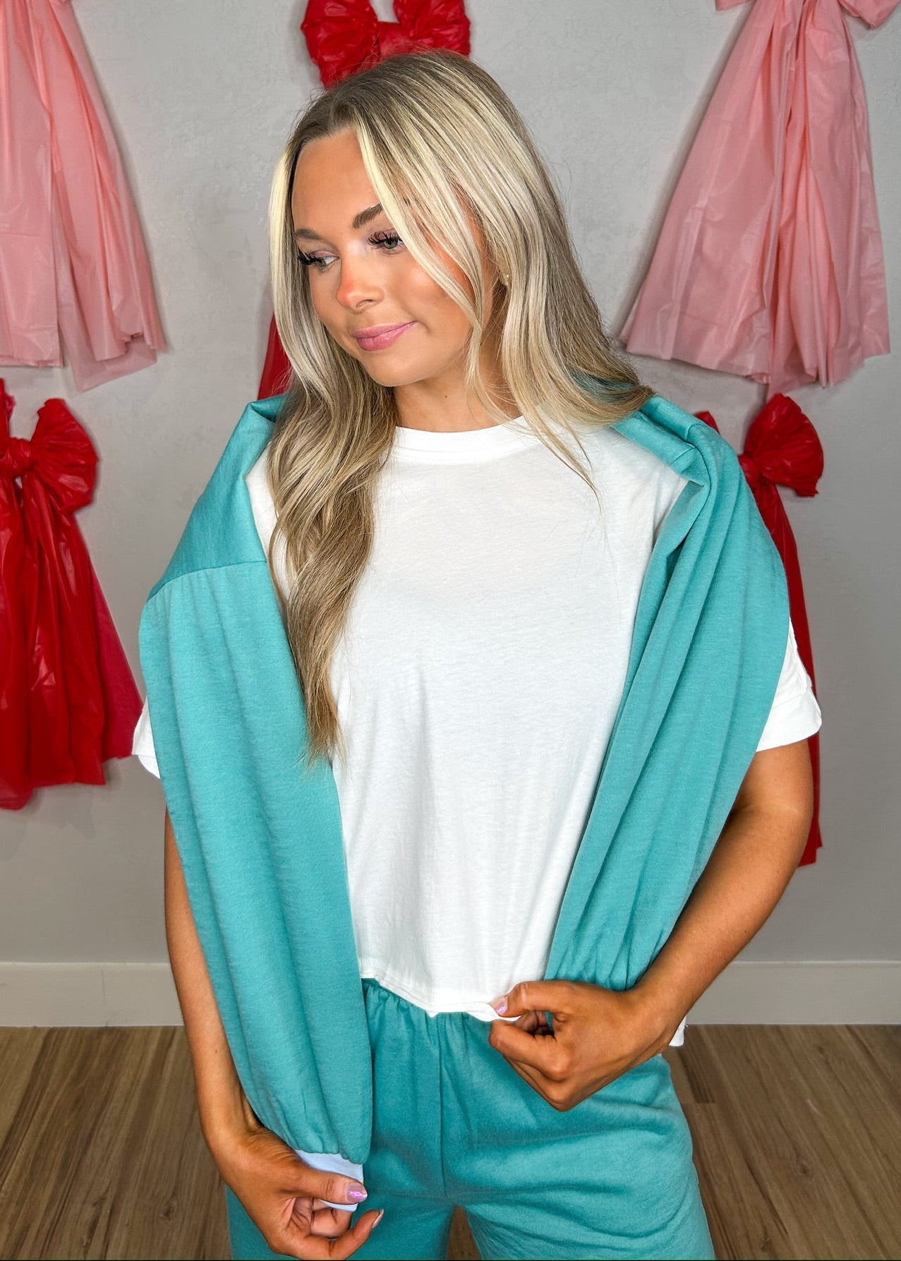 Snuggle up in style with our Retro Color Block Fleece Top! This soft fleece lined, long-sleeved delight in a vibrant turquoise is like a warm hug for your torso. Rock that v-neck with the cutest trim and show off some collarbone while you chill in comfort. Pair it with our matching pants (sold separately) for a complete look that says, “I woke up like this—totally cozy!”