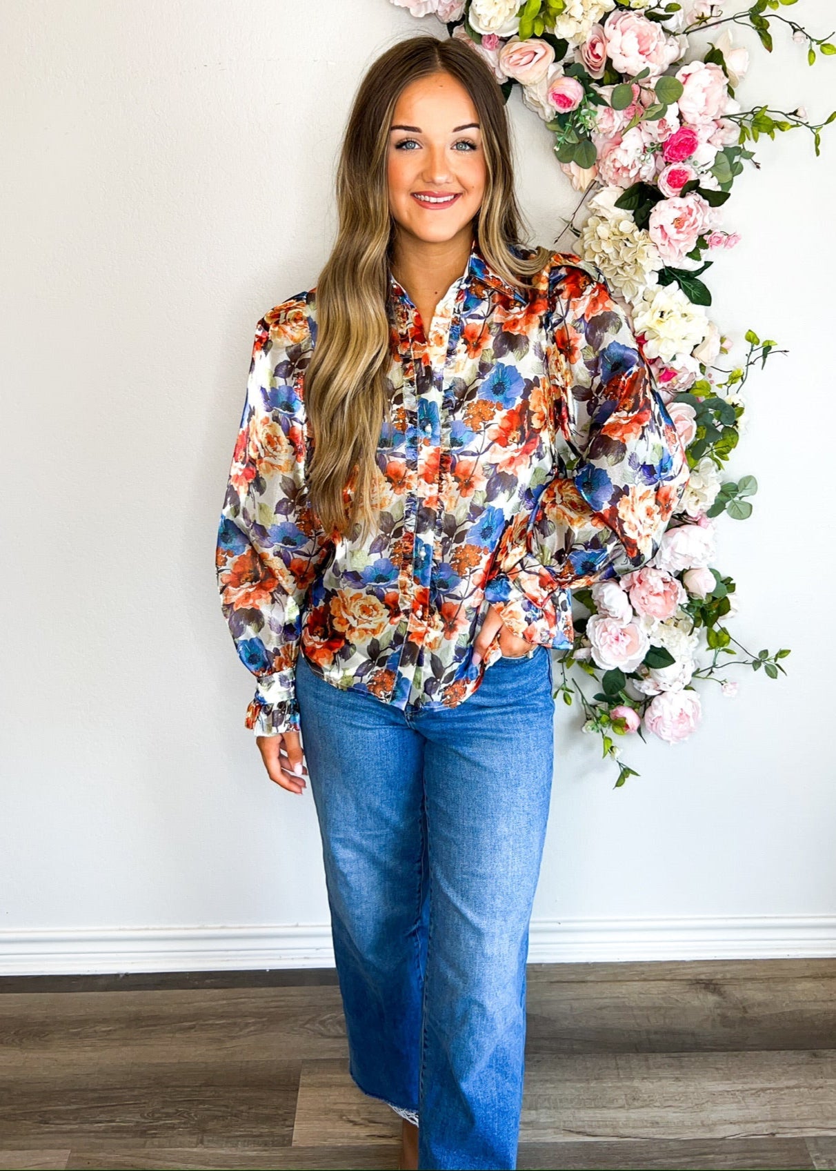 Get ready for fall in style with our Floral Watercolor Pearl Top! Featuring sheer puff long sleeves with cuffed sleeves, a pearl button down and a charming collared neckline. Perfect for the office on warm autumn days, with a chic floral design and a cute ruffle hem along the button down. Autumn just got cuter!