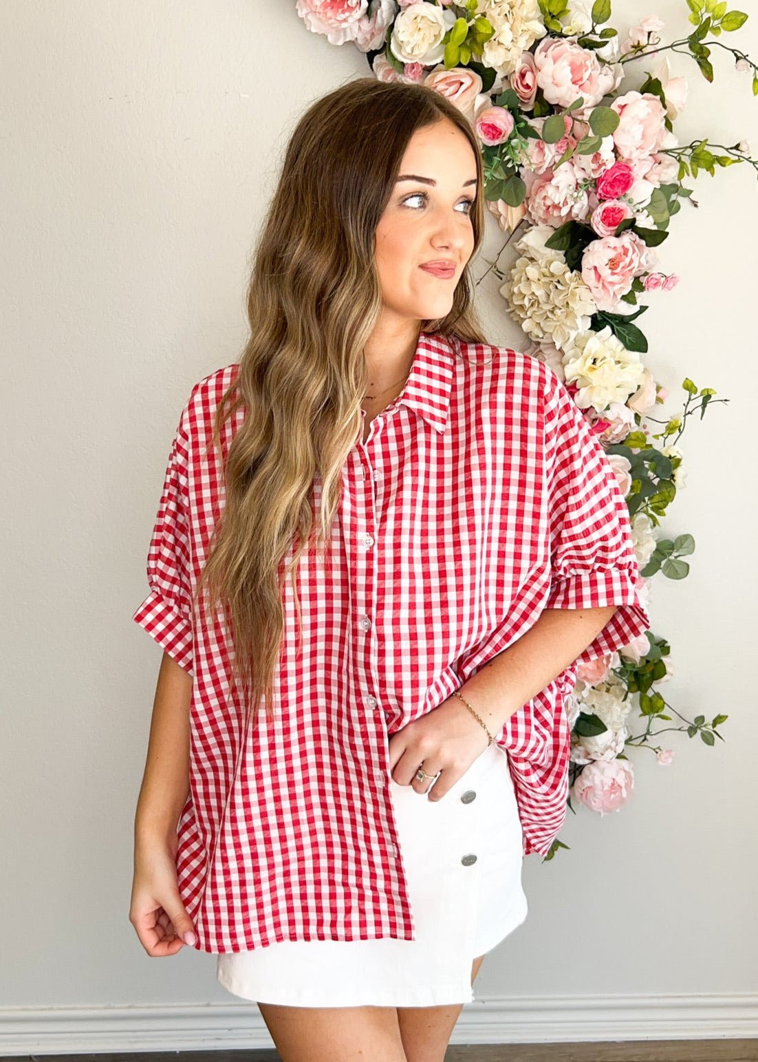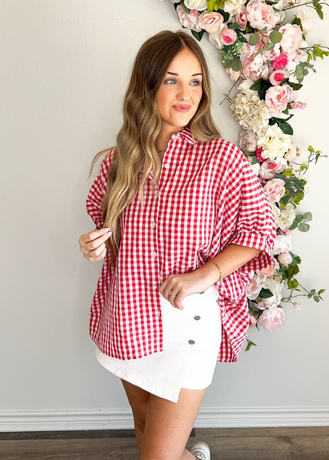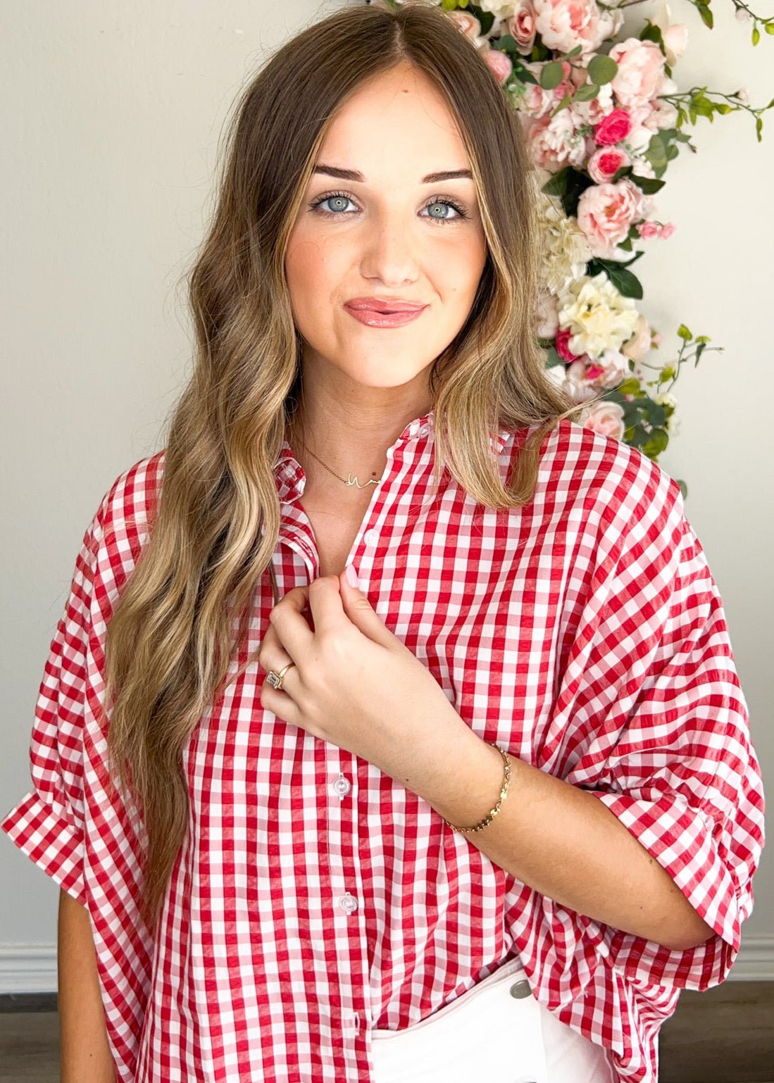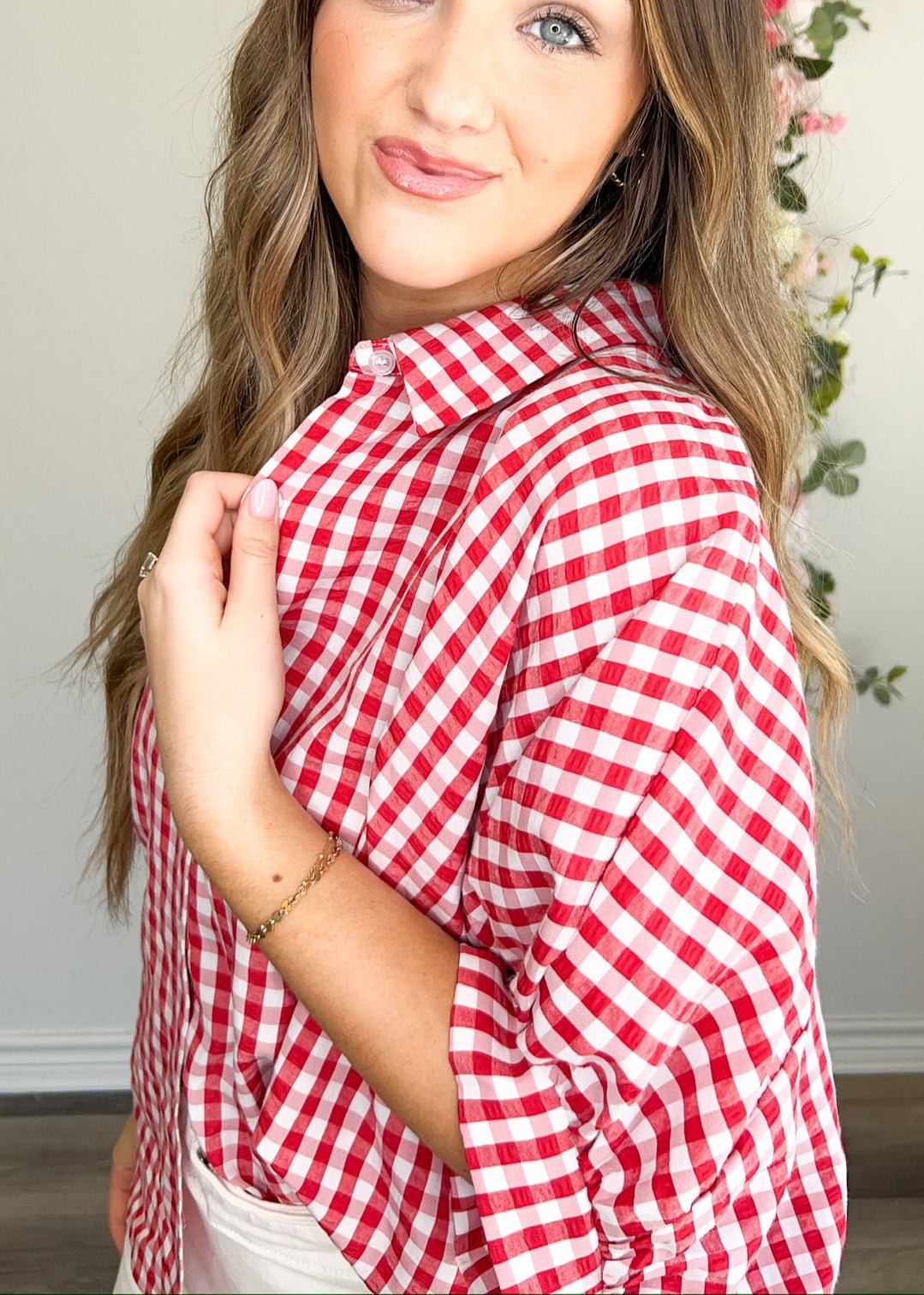 Features: Red gingham pattern, button down, lightweight, batwing sleeve