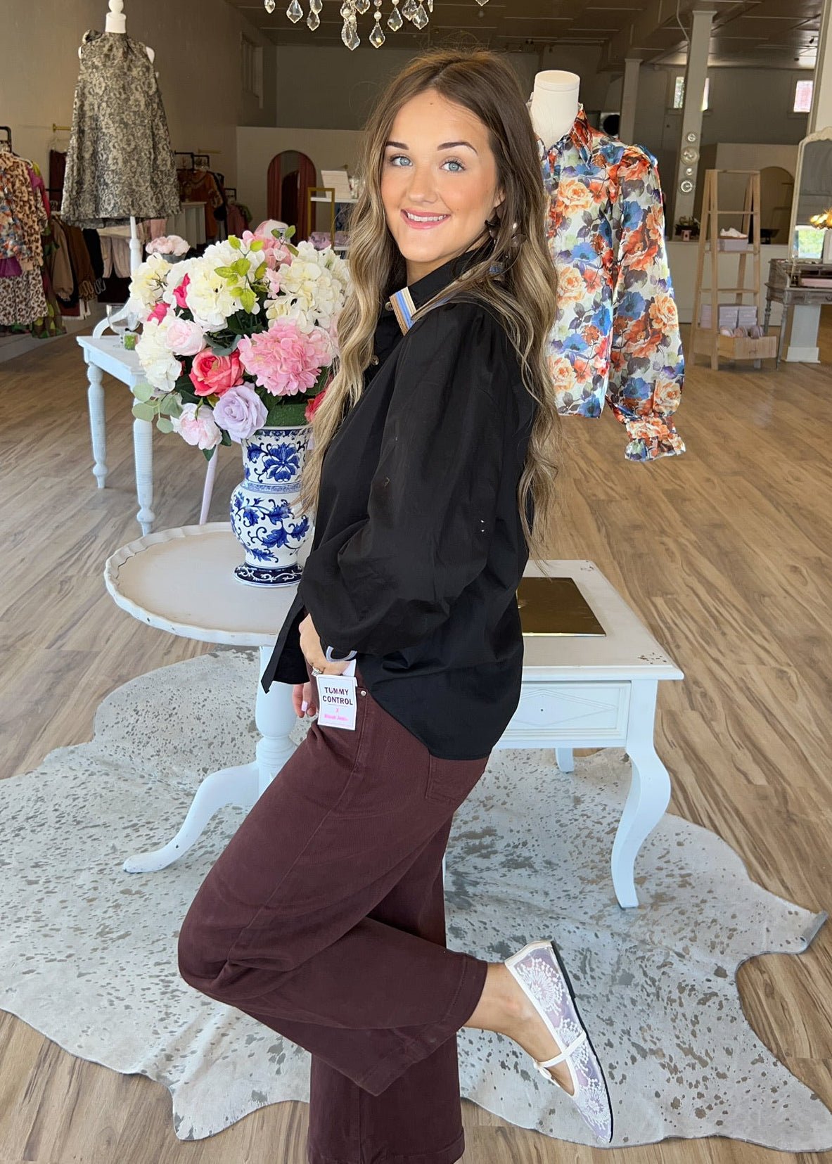 Step up your style with the Groovy Baby Top in Black. This professional beauty boasts embellishments on the collar and sleeve cuff, adding a touch of fun and class to your wardrobe. With a button down design, you'll look polished and put-together for any occasion. Upgrade your look today.