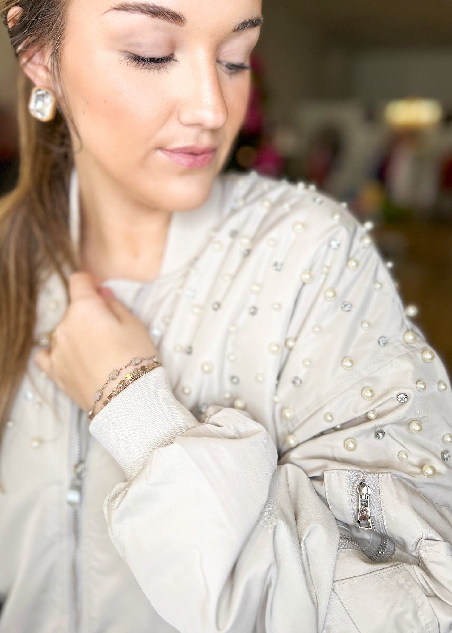 Features: Pearl and rhinestone detail on the front ,back and shoulders, front and side pockets, Pocket with zipper on sleeve