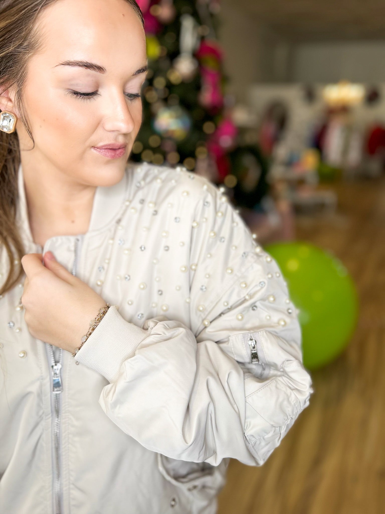 Sparkle and shine in our Rhinestone & Pearl Me Bomber Jacket. With pearl and rhinestone details on the front and back, this lightweight jacket adds a touch of glamour to any outfit. Functional front and side pockets, a full zip-up design, and a fully lined interior provide both style and convenience. Plus, the fun touches like a pocket and zipper on the sleeve make this jacket truly unique. Stay chic and cozy with our Me Bomber Jacket - Bone.