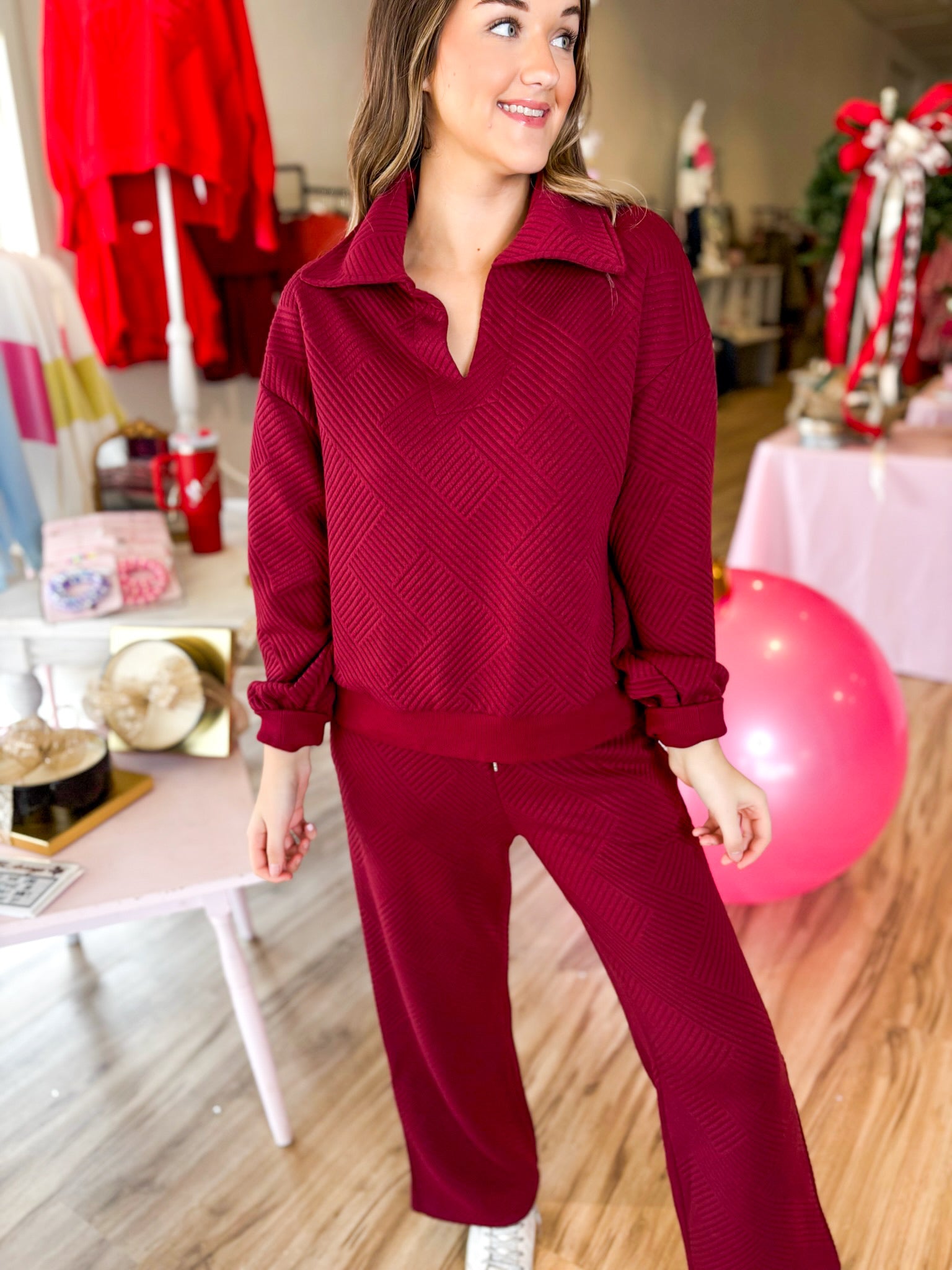 Slip into comfort with the Wine Me Down Pant Set, featuring a textured material that feels as good as it looks. These full-length pants come equipped with a practical elastic waistband and drawstring for the perfect fit, plus functional pockets to keep your essentials close. The classic collar adds a polished touch to this playful essential. Whether you're relaxing at home or stepping out, these versatile pants deliver style and comfort in one fabulous package.